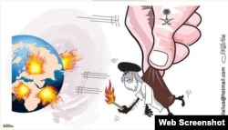 In this one, an Iranian feeds birds in a nest marked "terrorism":