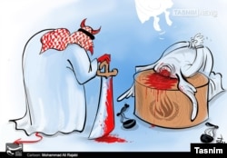 In this sample of cartoons, the predominant Saudi view could be summed up as: "Iran opposes Islamic State while fueling terrorism," and the Iranian view as: "Saudi Arabia claims to fight Islamic State while executing innocents, just like IS."