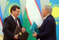 Kazakh President Nursultan Nazarbaev (right) and Shavkat Mirziyaev exchange documents during a signing ceremony following their meeting in Astana in March.
