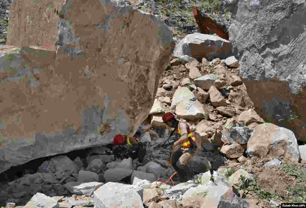 Army rescuers move the body of a miner from the site after a rockslide at a marble mine in the mountainous Mohmand district of Khyber Pakhtunkhwa Province.
